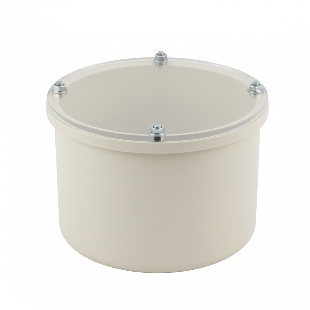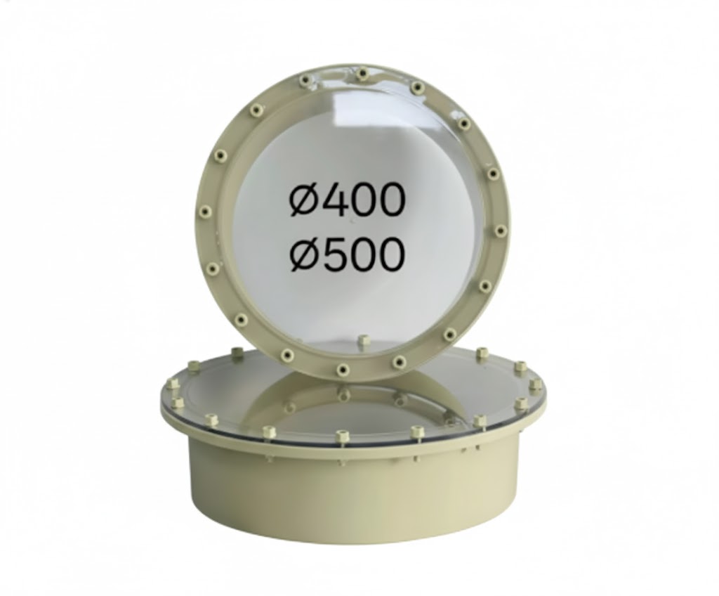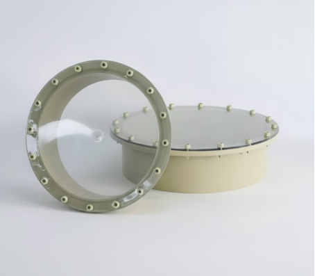Cửa sổ quan sát: Phần chính giữa là một tấm vật liệu trong suốt, cong lồi (có thể là Acrylic hoặc Polycarbonate) được thiết kế để cho phép người vận hành quan sát trực tiếp các quá trình đang diễn ra bên trong thiết bị (ví dụ: mức chất lỏng, tình trạng phun sương, hoặc tình trạng đóng cặn).